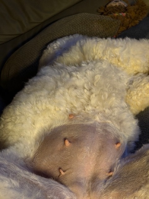 Ich telefoniere mit netten Welpeninteressenten und einer Züchterkollegin und erzähle, dass ich glaube, dass Bumbac die letzte Nacht gespuckt hat. Ganz nach Lehrbuch wie auch in der vorigen Trächtigkeit. Da ich das nur im Halbschlaf wahrgenommen habe und morgens nichts gefunden, bin ich aber nicht sicher. Um genau zu sein, habe ich das also dreimal am Telefon erzählt.